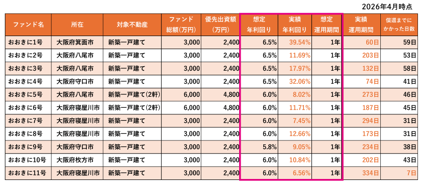 11ファンド【3億9,000万円】が運用を終了し、こちらもすべて元本毀損なく償還しています。