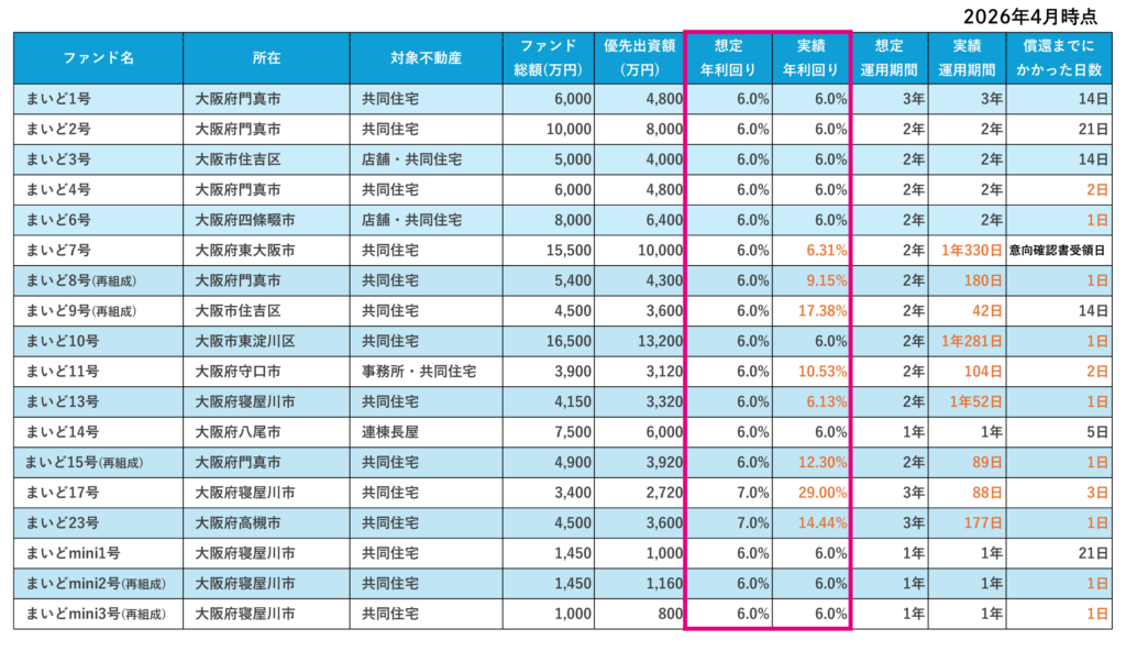多くのファンドでは、当初の計画通り年利6.0%〜7.0%前後での運用となっていますが、一部のファンドでは早期売却等により想定を上回る結果となりました。